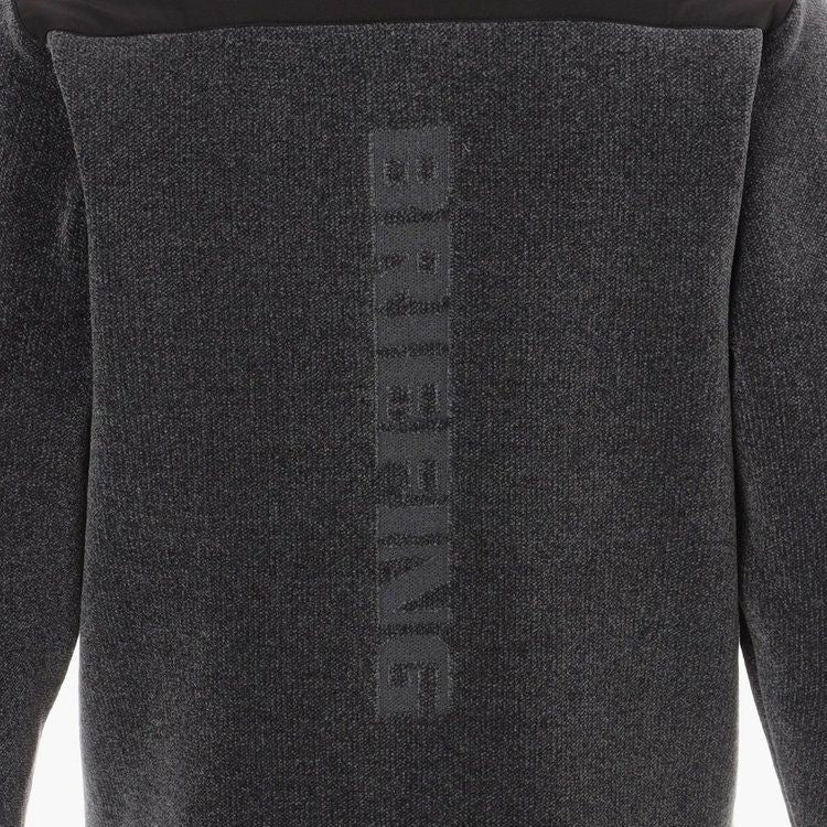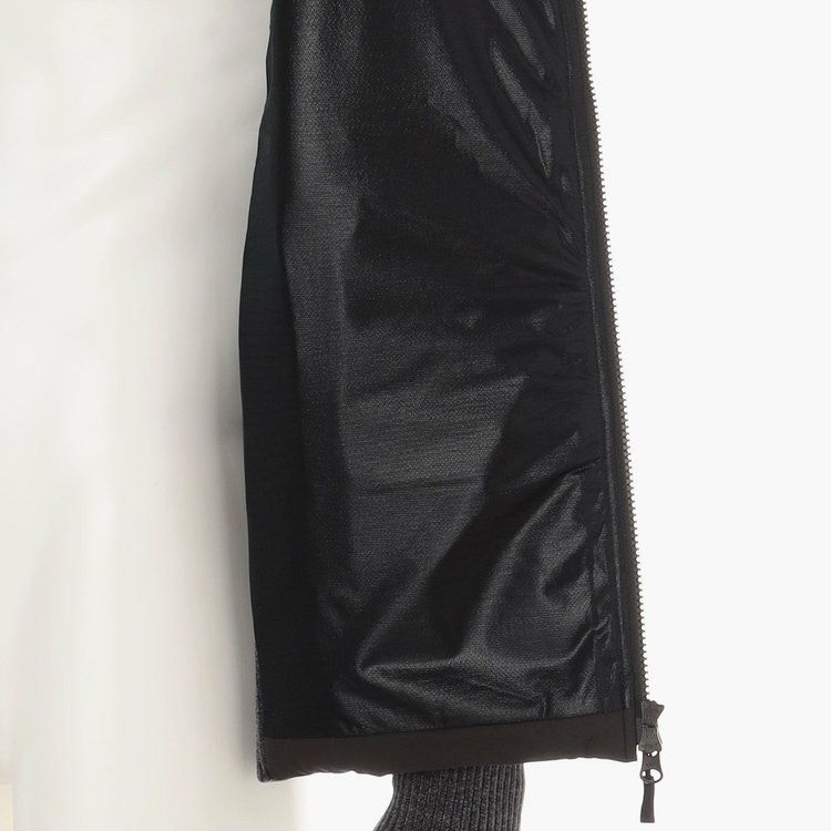 ・前身頃の表地には縦横自由自在に伸縮するストレッチ性と、優れた撥水性を持った素材を、袖や後ろ身頃には光沢感と柔らかな質感が特徴的なニットを使用。