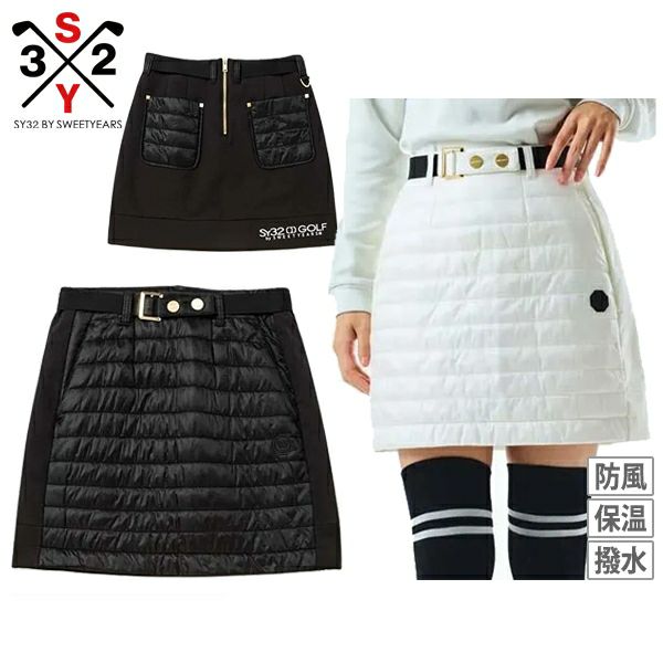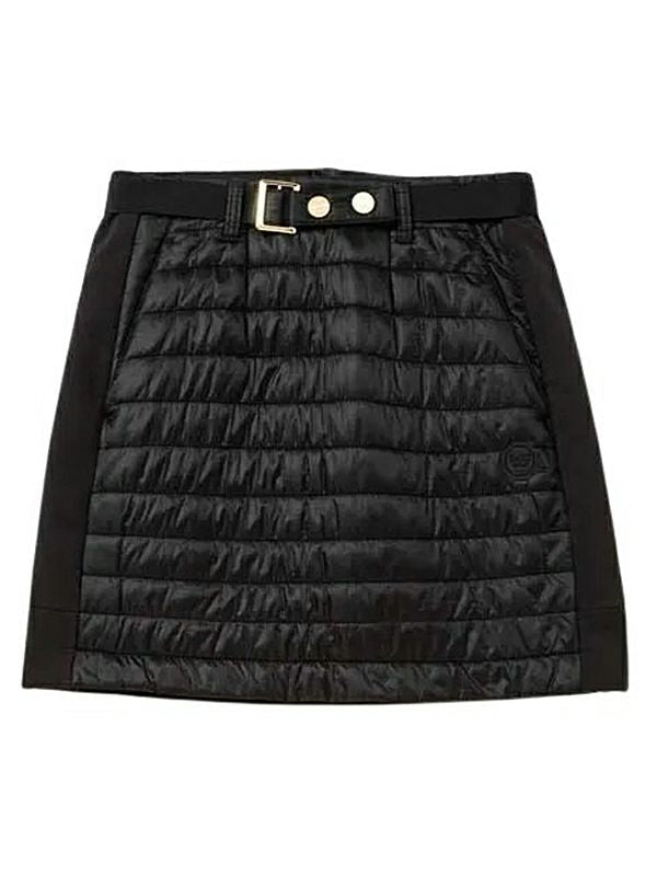 スカート 異素材コンビ 保温 防風 撥水 中綿キルト×ストレッチ布帛素材 テープベルト付き ロゴワッペン ゴルフウェア