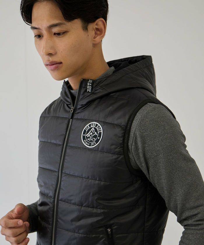 ベスト フード付き 中綿入り 裏微起毛 保温 発熱 撥水 防寒 微光沢感 ロゴワッペン