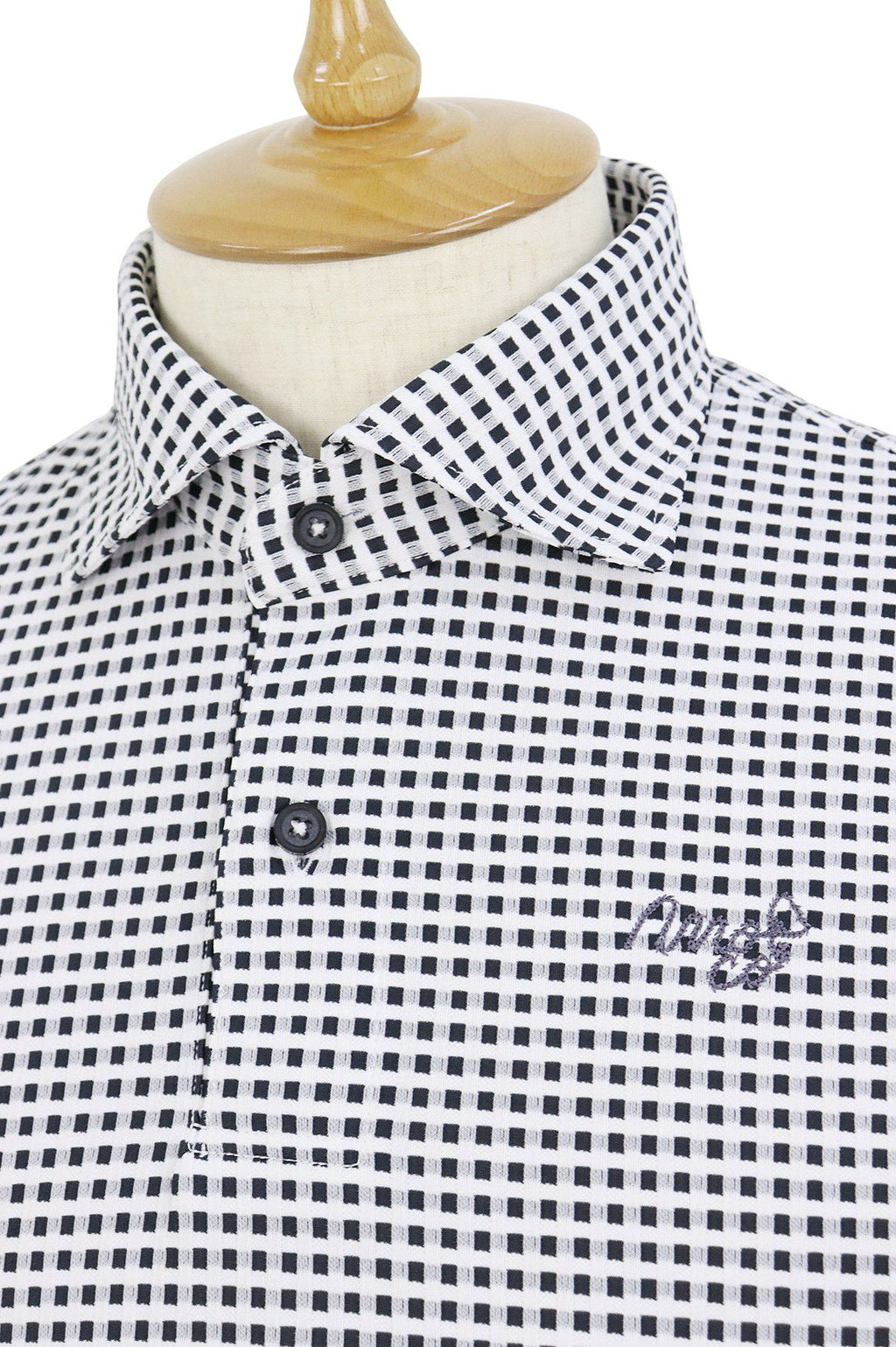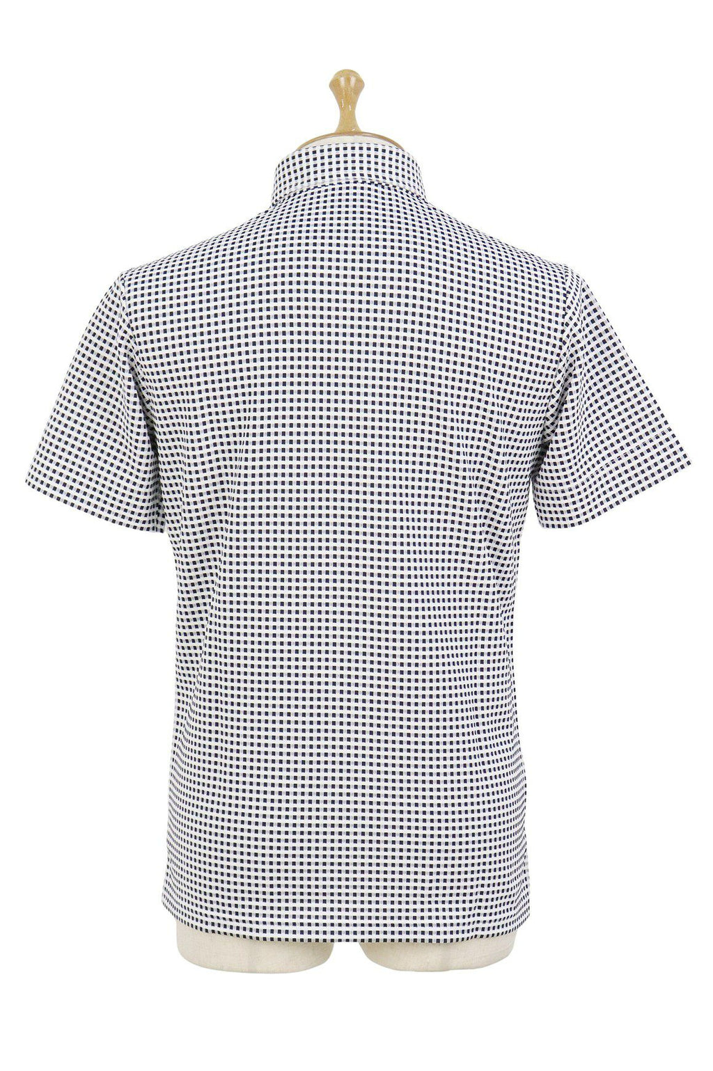 Polo shirt, short sleeve, UV protection, stand collar shirt, wide collar, gingham check pattern, all-over pattern, logo embroidery, golf wear