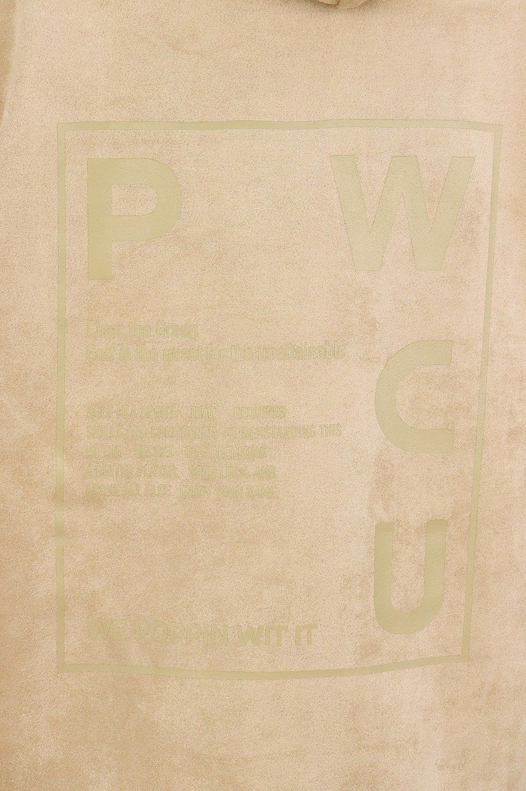 We use a polyester/polyurethane blend cardboard jersey material that is brushed to look like suede.