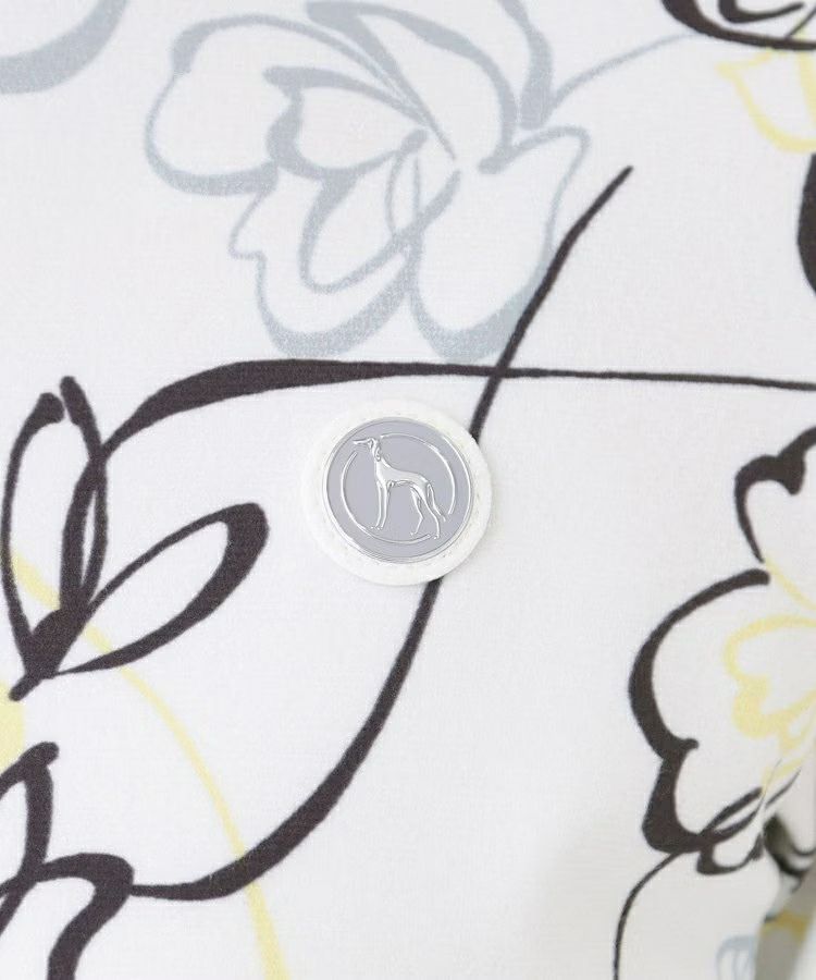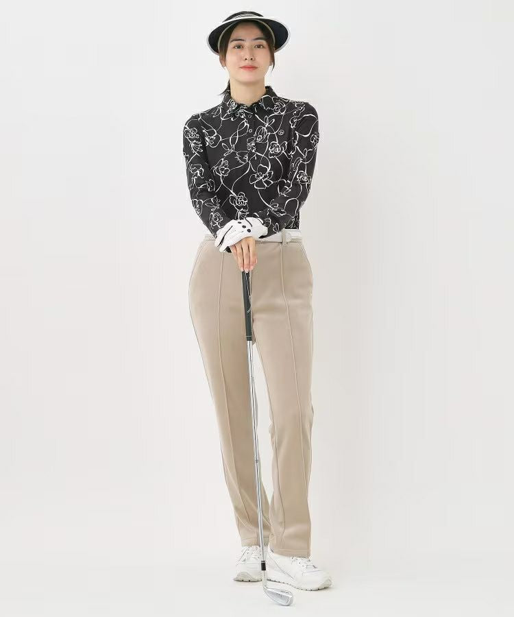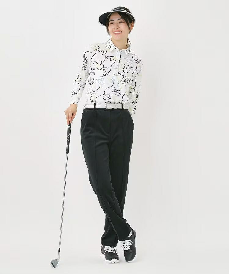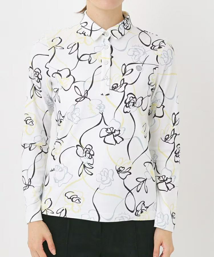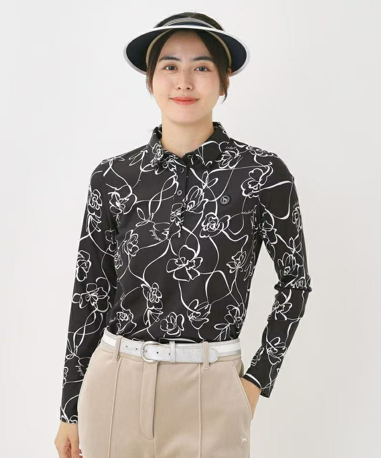ポロシャツ 長袖 裏起毛ドローイングフラワー長袖ポロシャツ ゴルフウェア