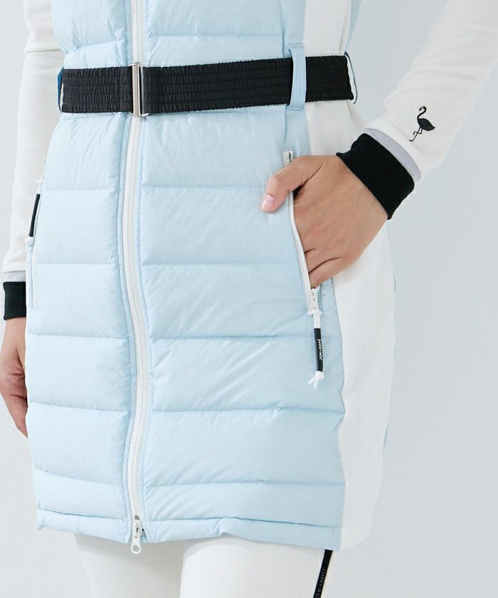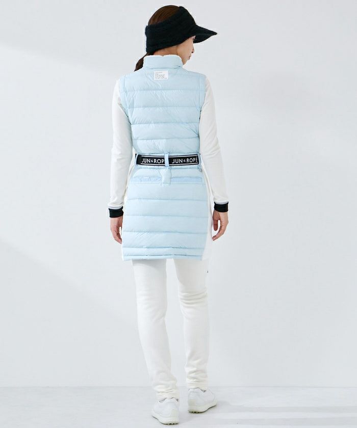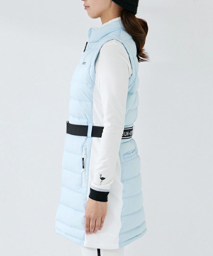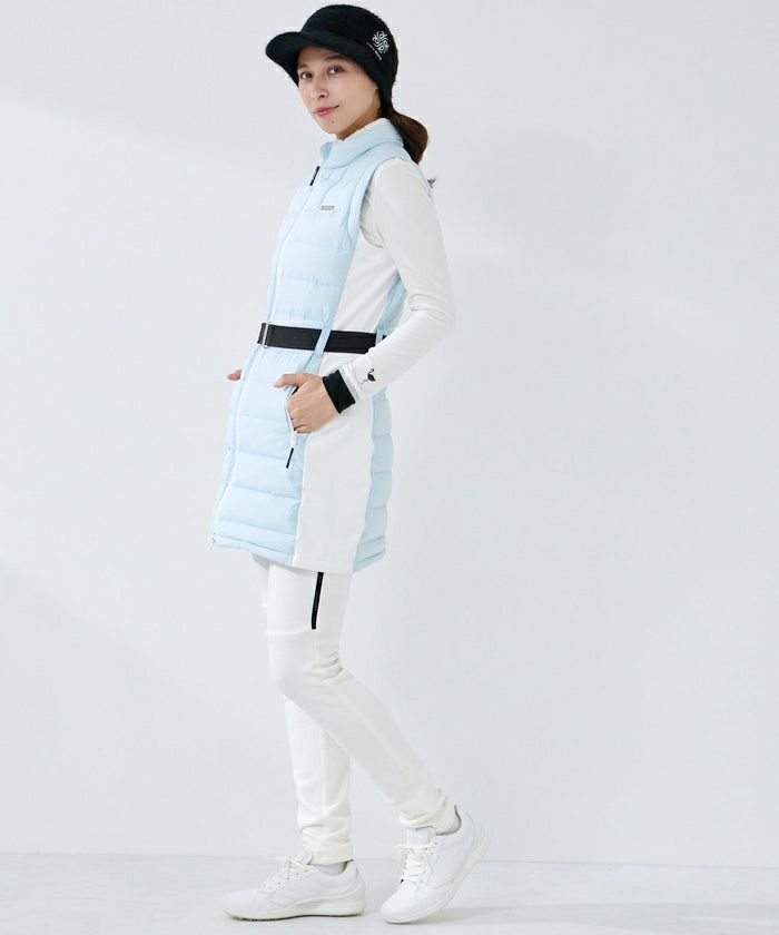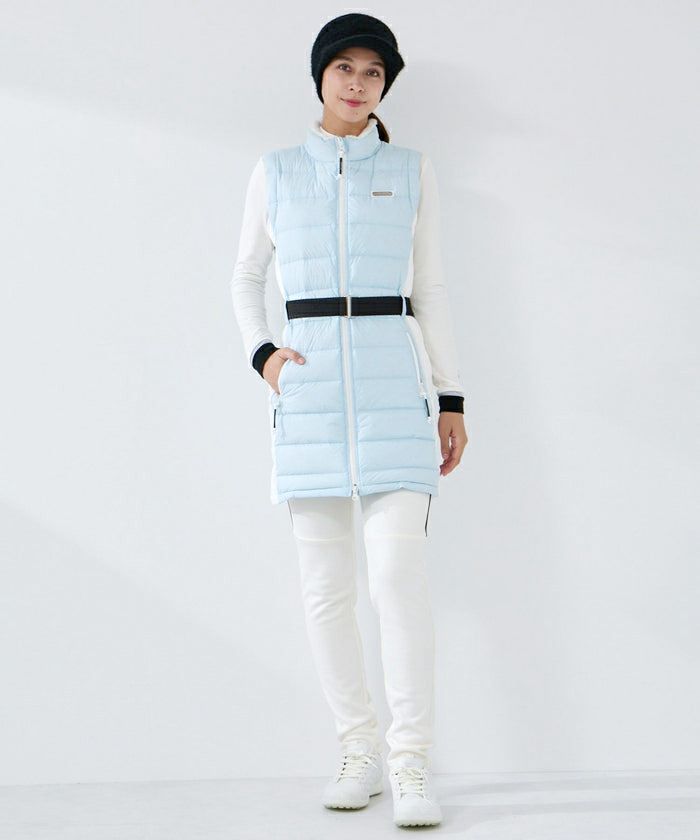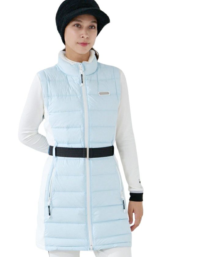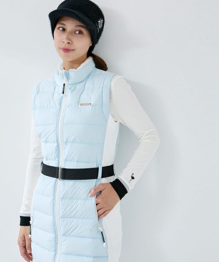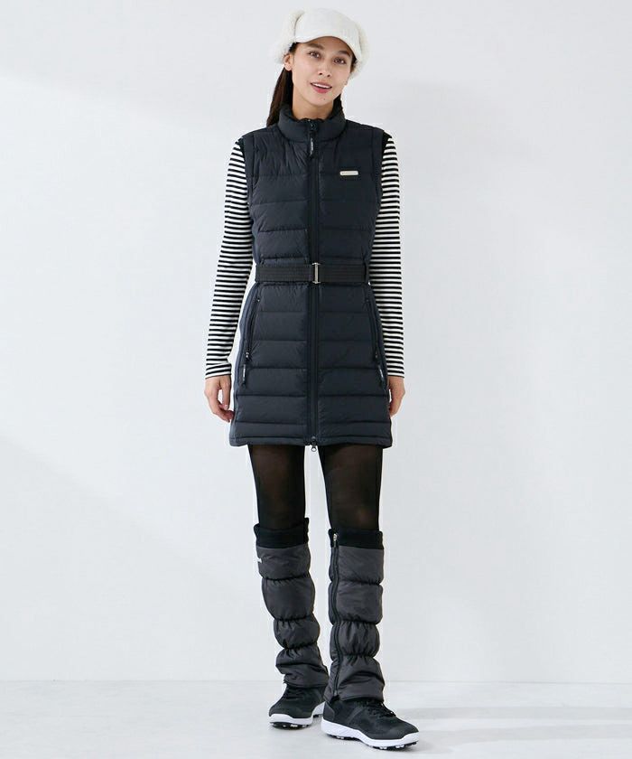 ワンピース カバーワンピース ロングベストにもなる ダウンワンピース ストレッチ 保温 防寒 衿内側ファー素材 二重織ナイロンタフタ素材 サイド裏起毛素材 ゴムベルト付き ロゴワッペン ゴルフウェア