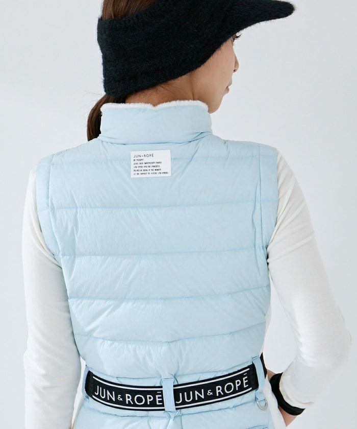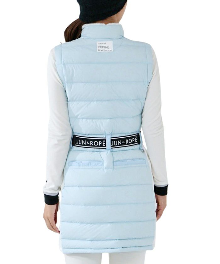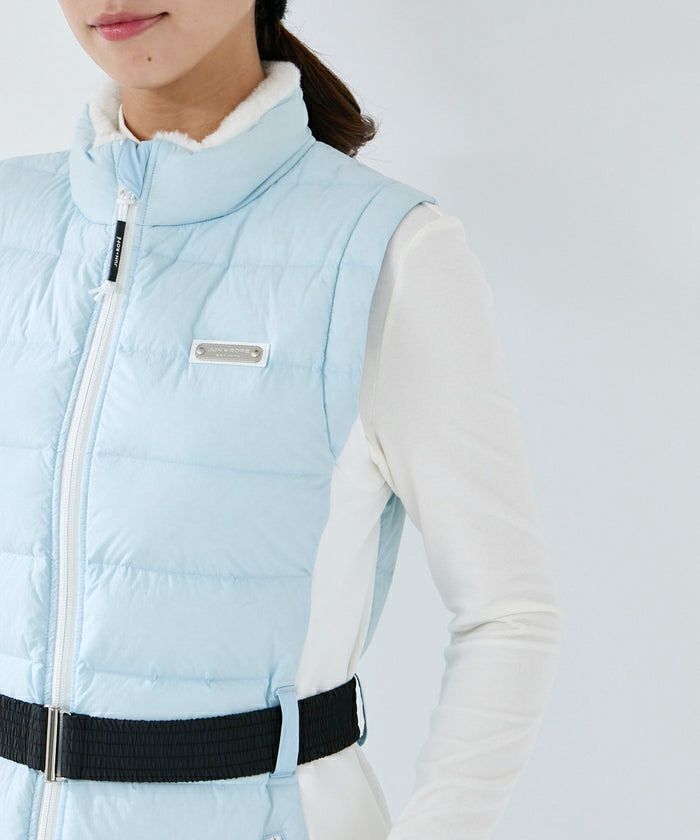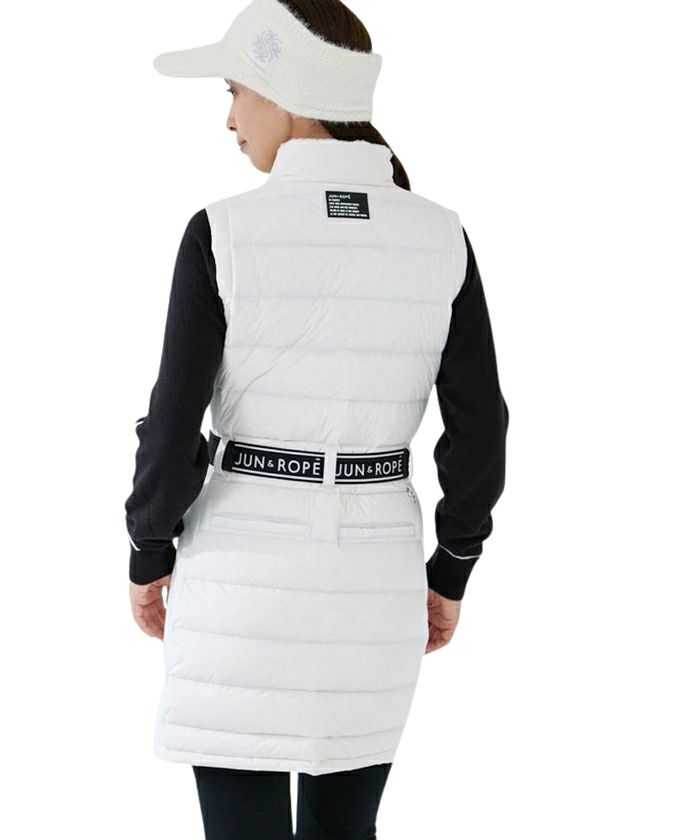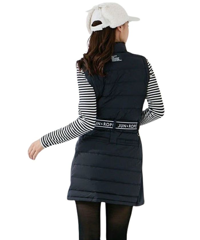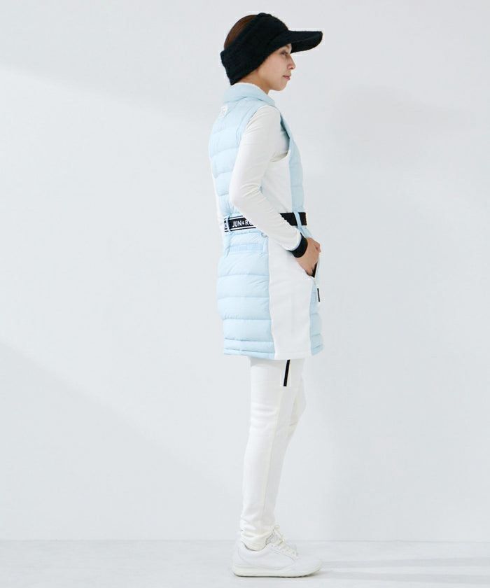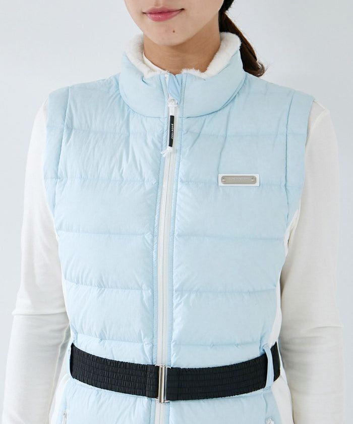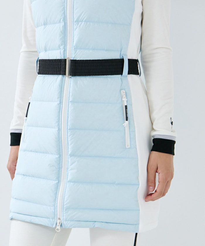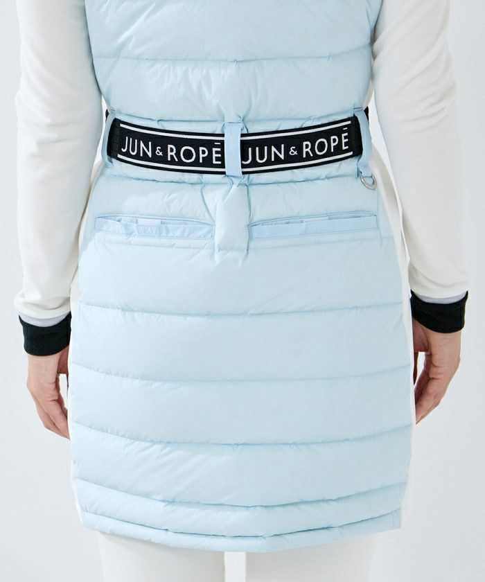 ワンピース カバーワンピース ロングベストにもなる ダウンワンピース ストレッチ 保温 防寒 衿内側ファー素材 二重織ナイロンタフタ素材 サイド裏起毛素材 ゴムベルト付き ロゴワッペン ゴルフウェア