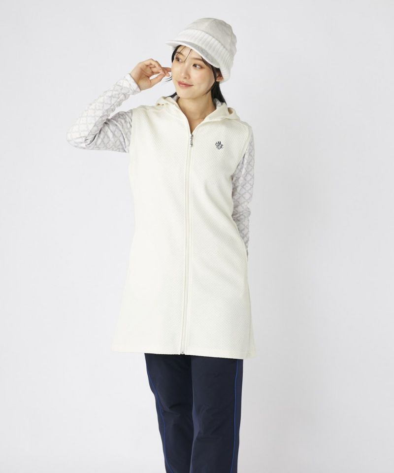 ワンピース フード付き 前開きワンピース ワンピースベスト 保温 UVカット キルト風ジャガード素材 凹凸感 ロゴ刺繍 M~3Lまでご用意 ゴルフウェア