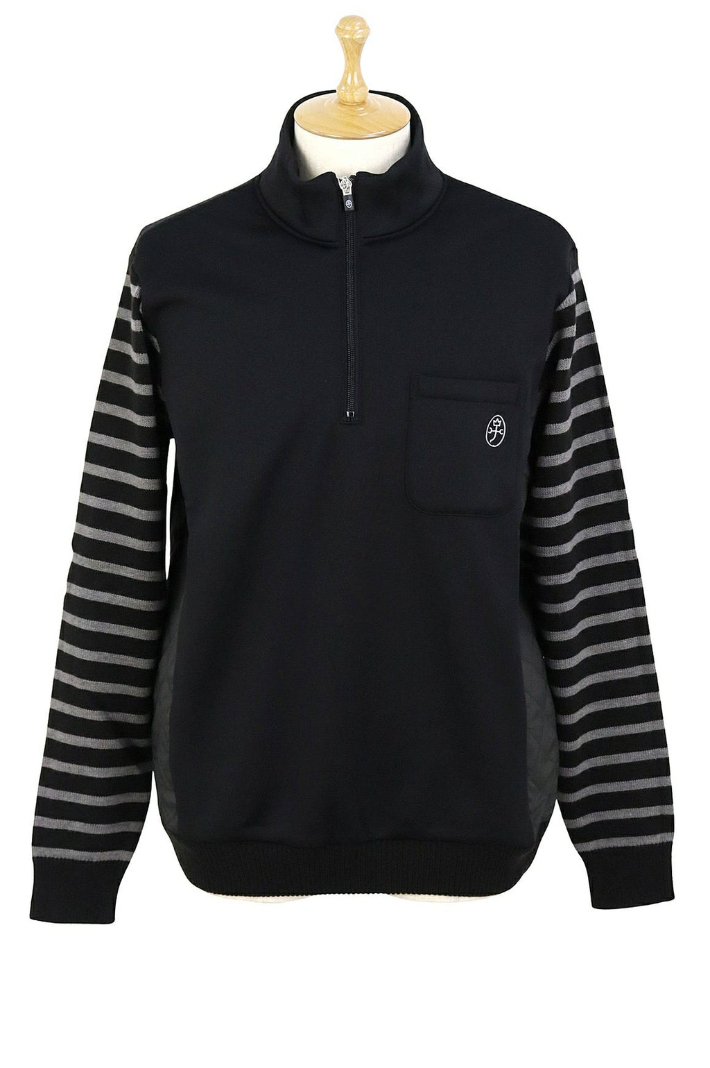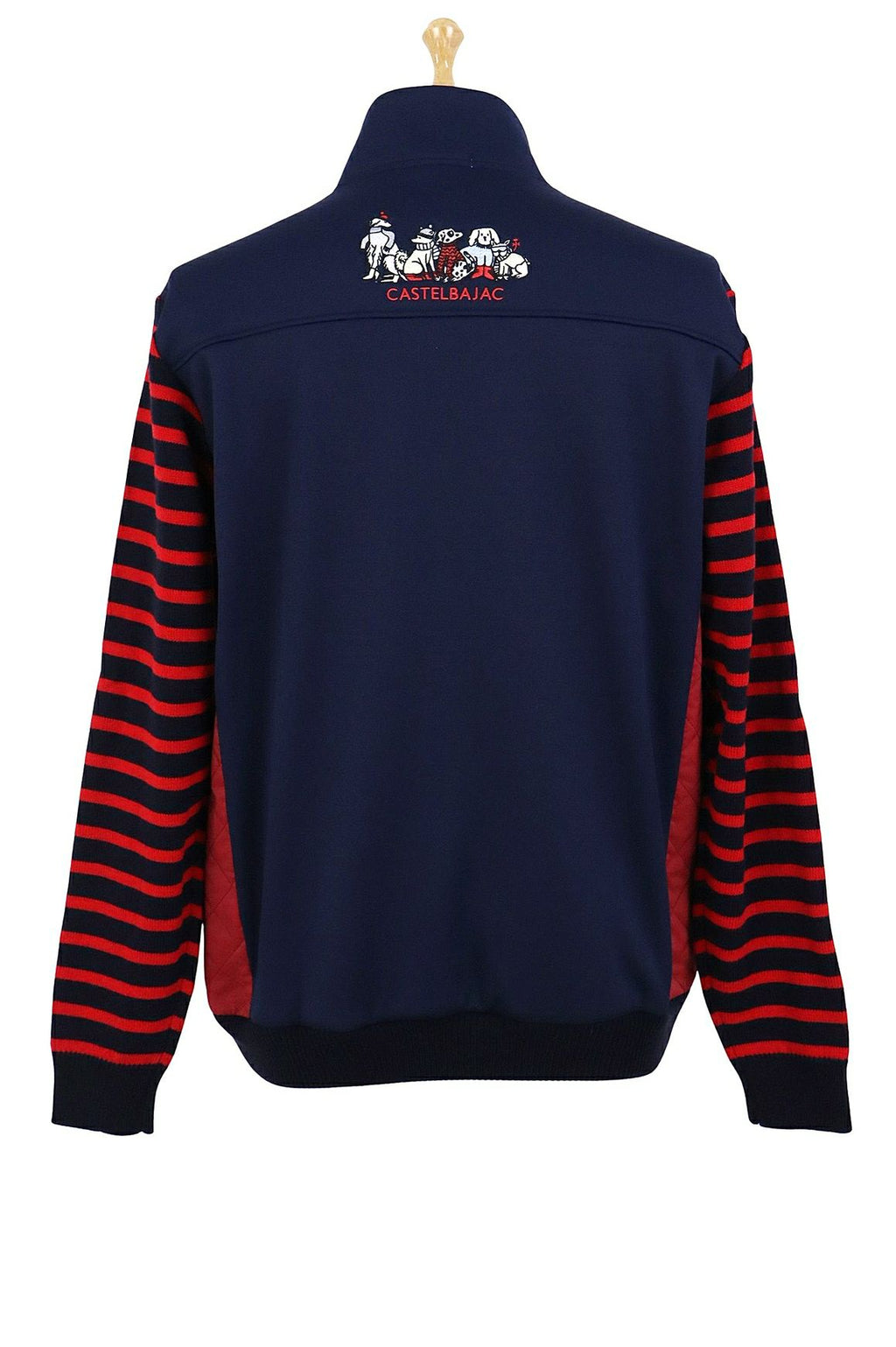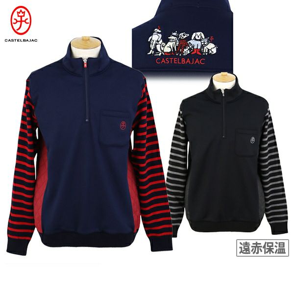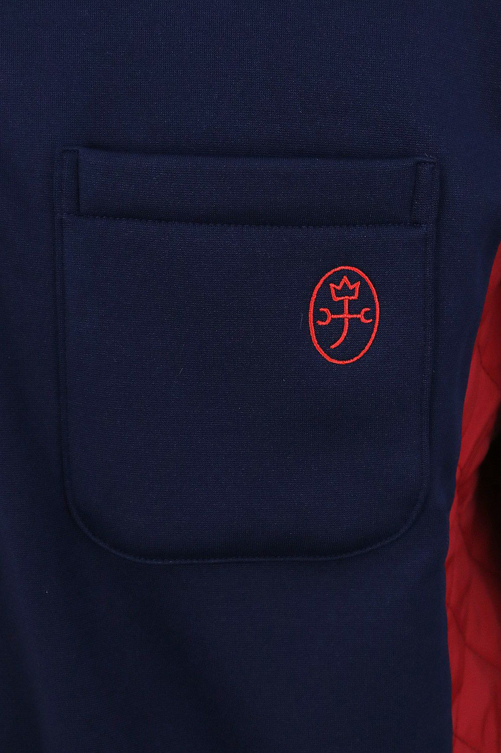 トレーナー ハープジップ ハイネック 遠赤保温 異素材切替え 裏ボアジャージ素材×ボーダーニット×キルト素材 胸ポケット付き 犬キャラクター刺繍 ゴルフウェア