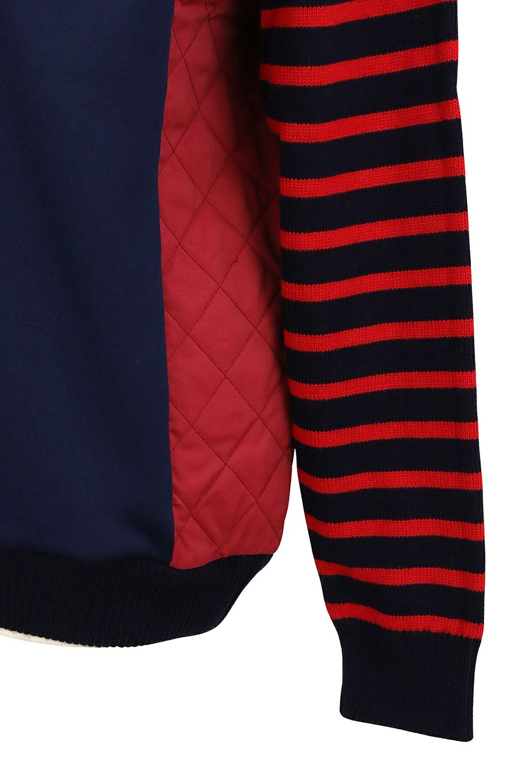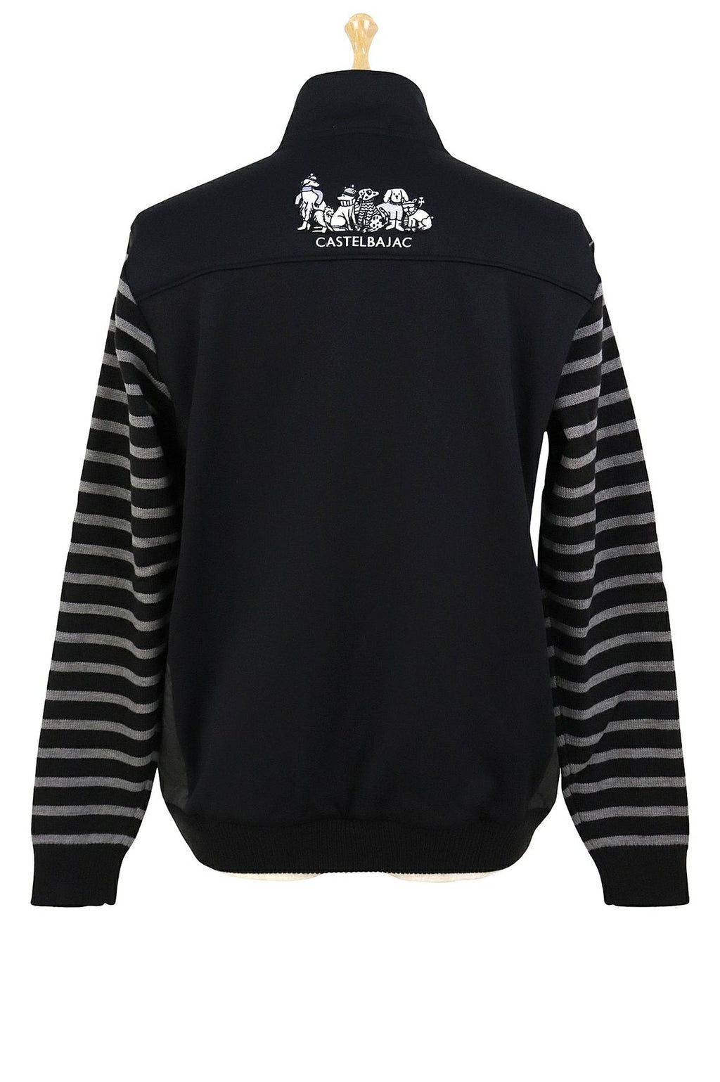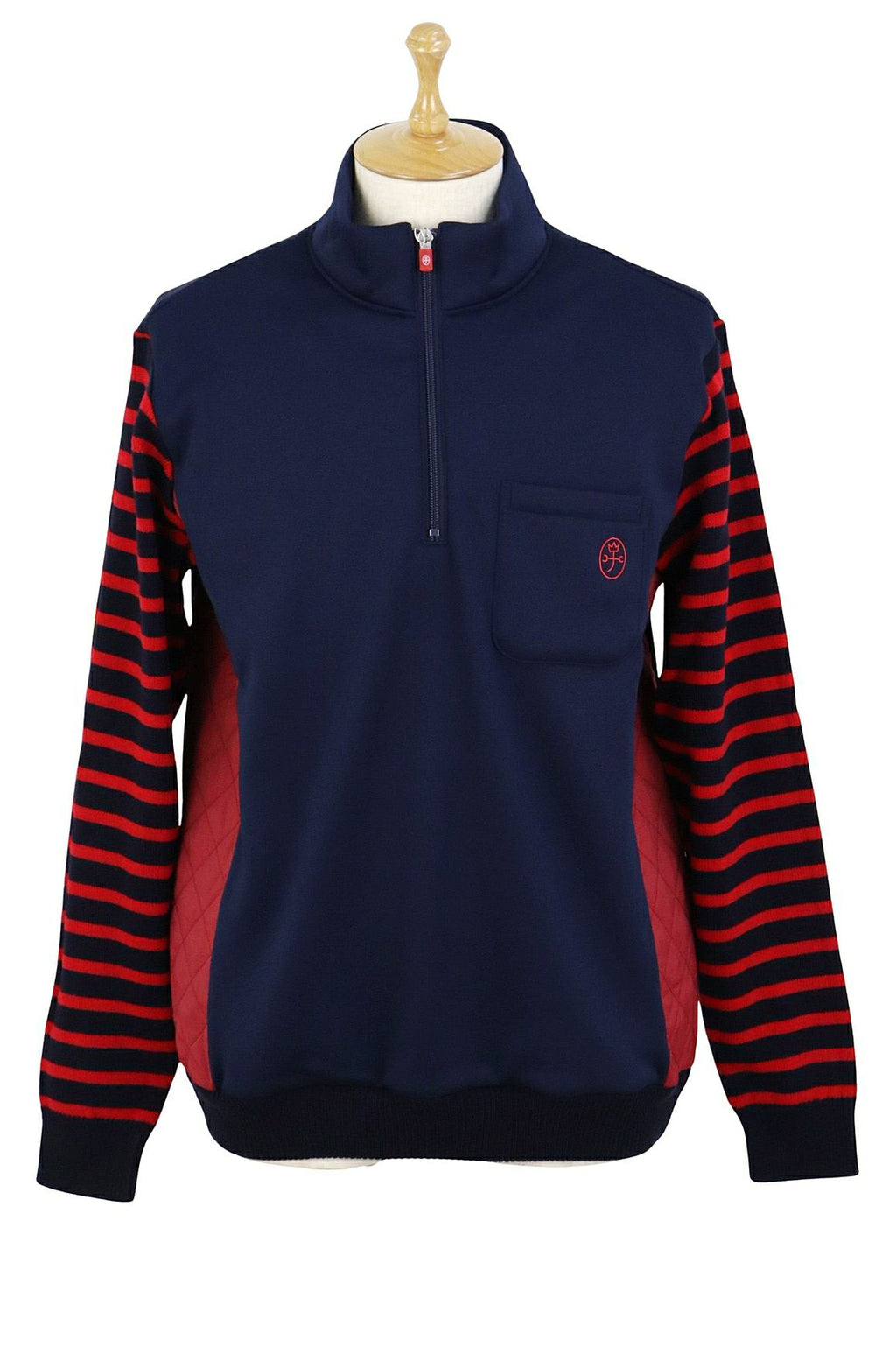 トレーナー ハープジップ ハイネック 遠赤保温 異素材切替え 裏ボアジャージ素材×ボーダーニット×キルト素材 胸ポケット付き 犬キャラクター刺繍 ゴルフウェア