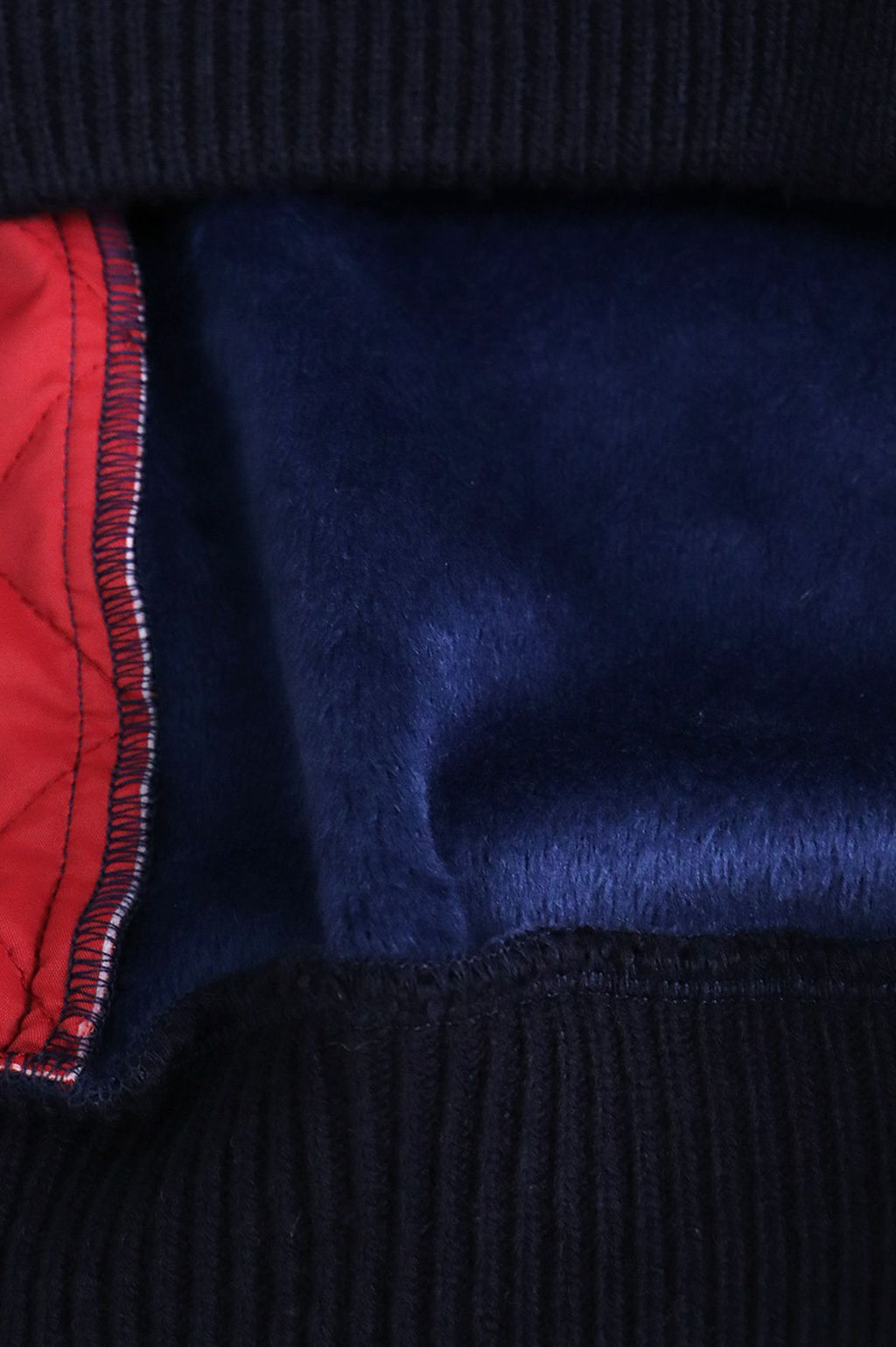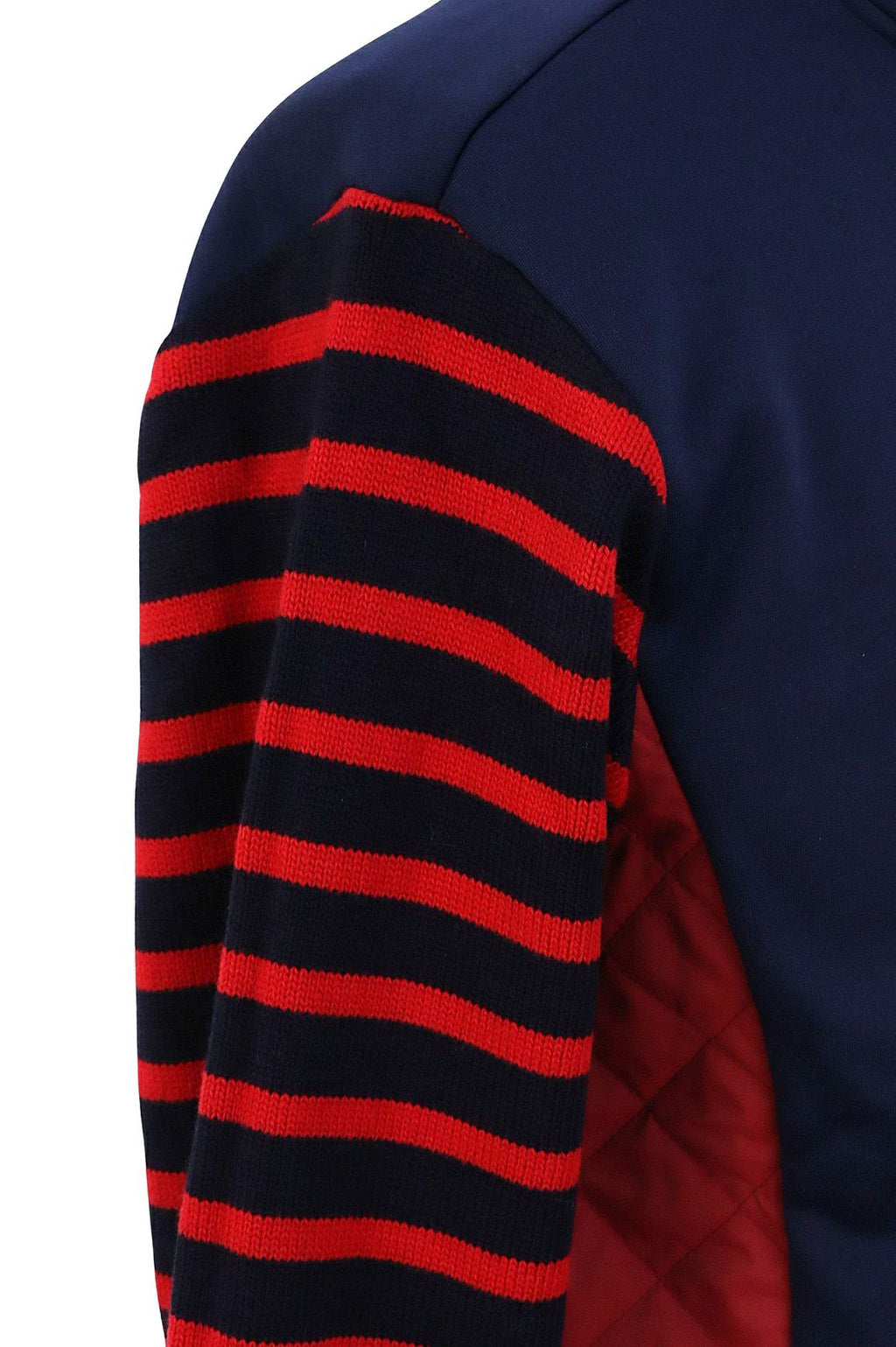 トレーナー ハープジップ ハイネック 遠赤保温 異素材切替え 裏ボアジャージ素材×ボーダーニット×キルト素材 胸ポケット付き 犬キャラクター刺繍