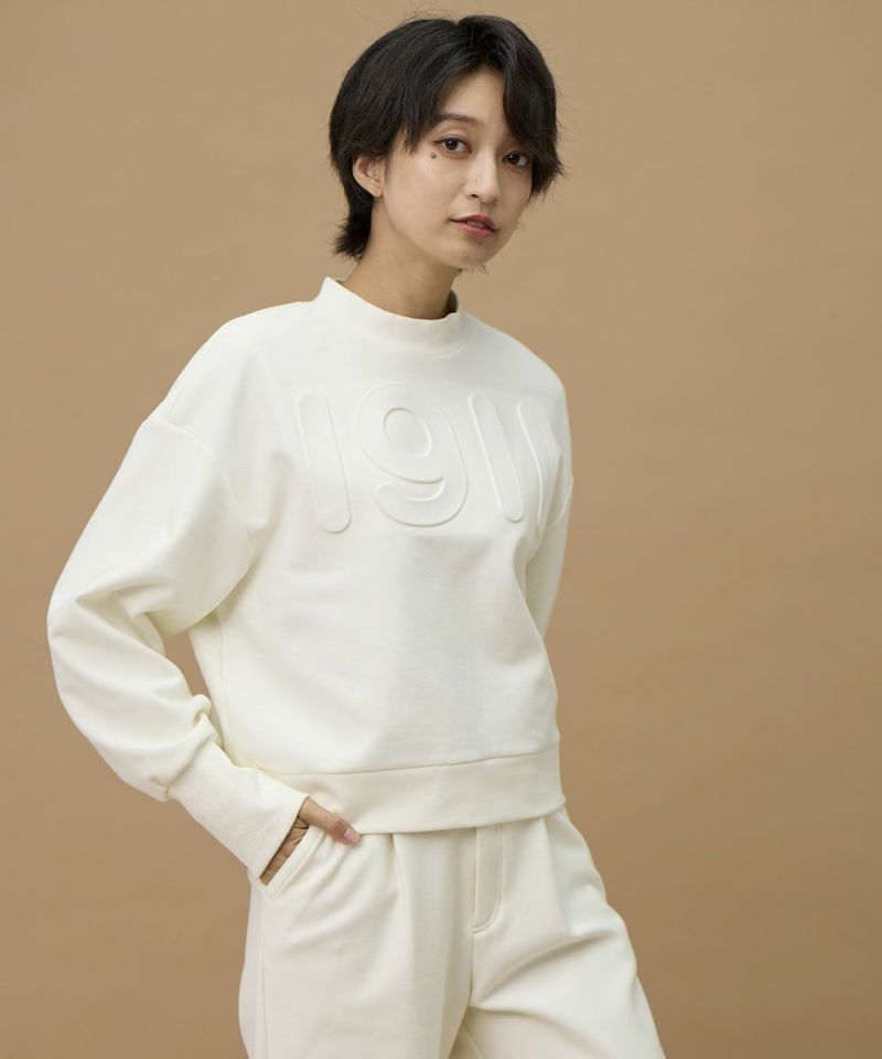 トレーナー ハイネック モックネック ショート丈プルオーバー バルーン袖 コットン混紡 保温 ゆったりシルエット エンボスロゴデザイン ゴルフウェア